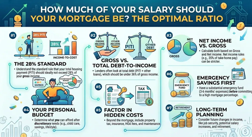 A widely accepted guideline is that your mortgage should not exceed 28% to 30% of your gross monthly income. Gross income refers to your total income before taxes and deductions.